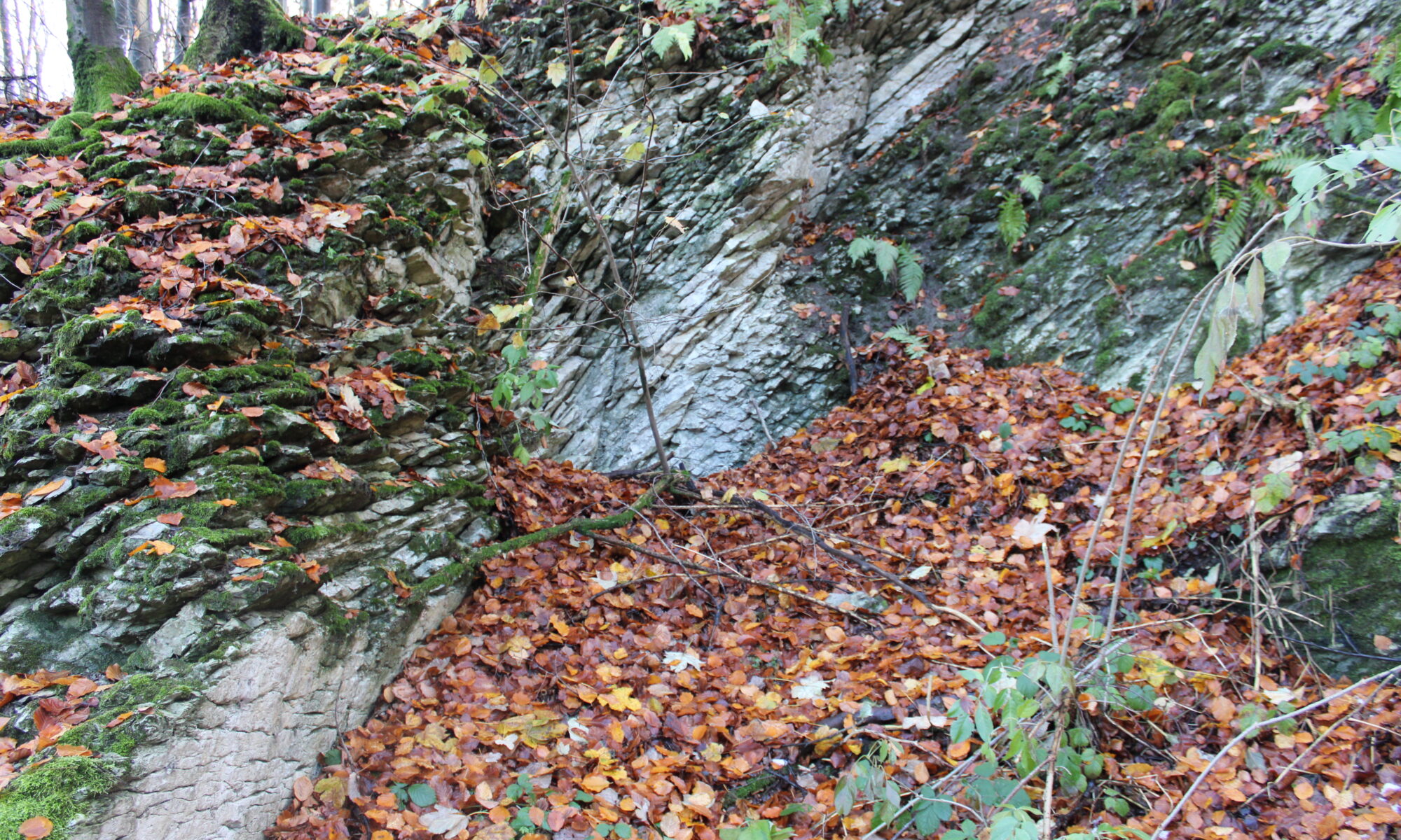 Nach etwa 850 m liegt links ein kleiner Aufschluss. Hier können Sie die schräggestellten Schichten sehr gut erkennen.